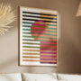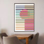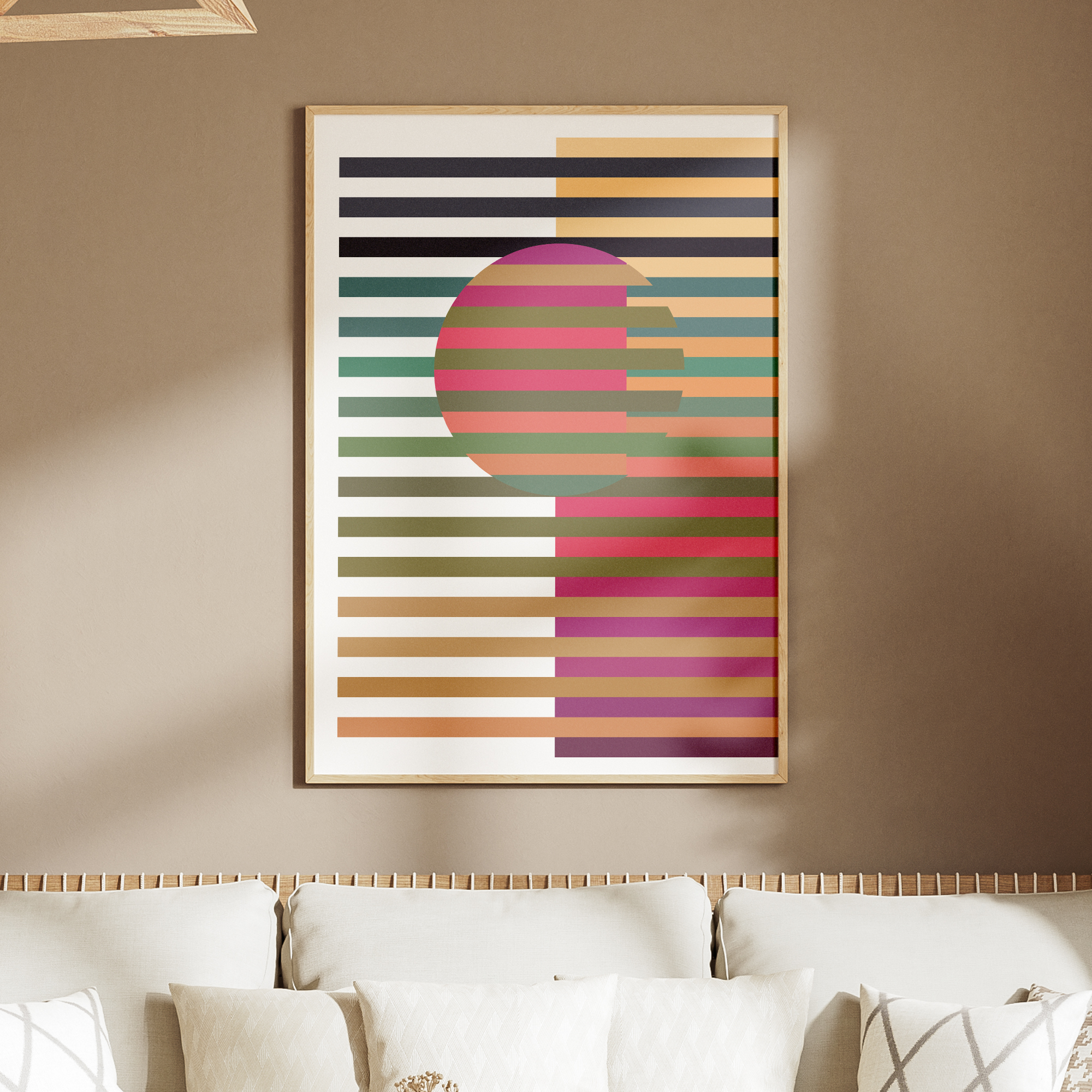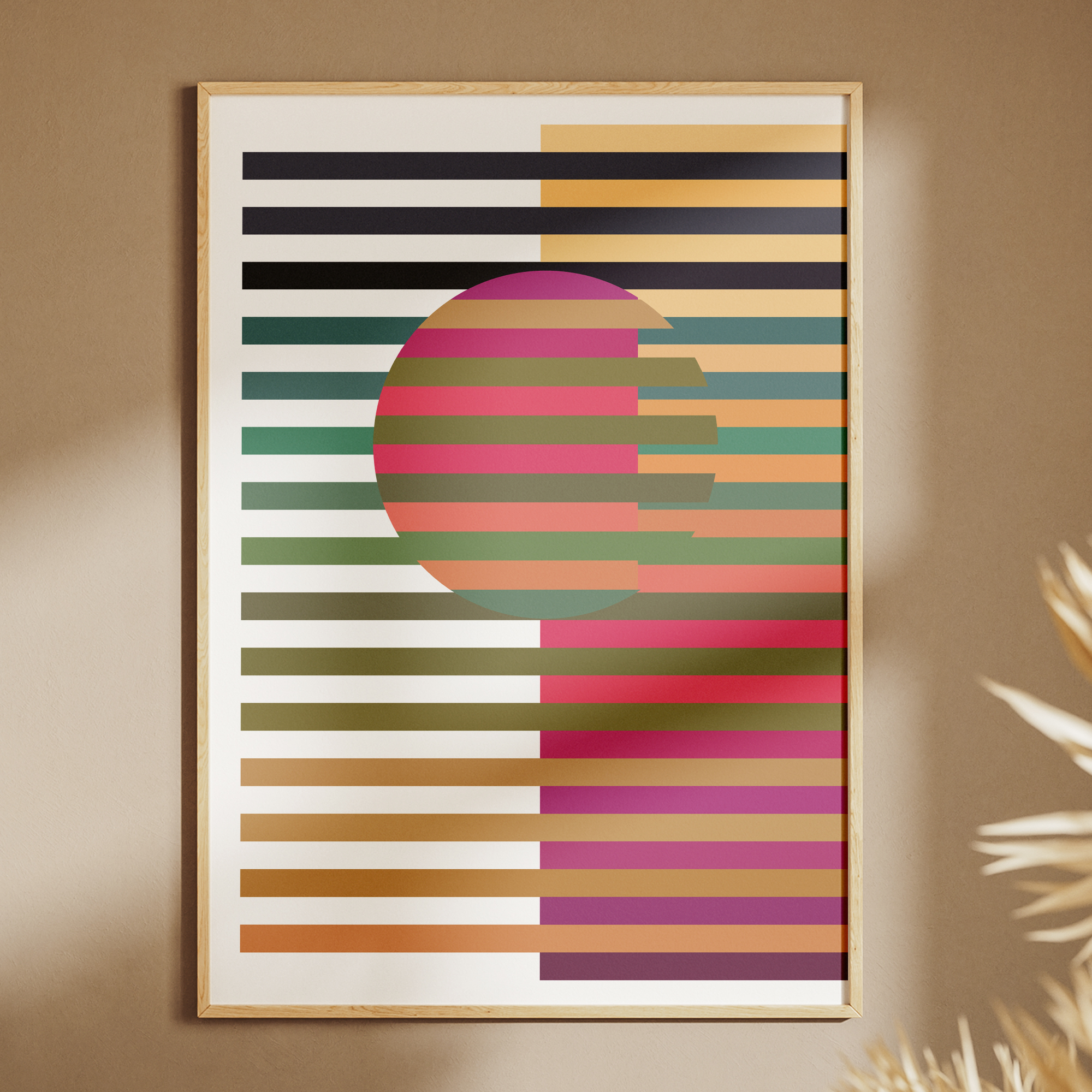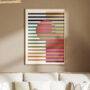 A striking abstract artwork where horizontal color bands intersect with a central circular form. The balanced contrast of warm and cool tones creates visual intrigue while maintaining harmony. A perfect choice for contemporary dining spaces, offices, or modern apartments.